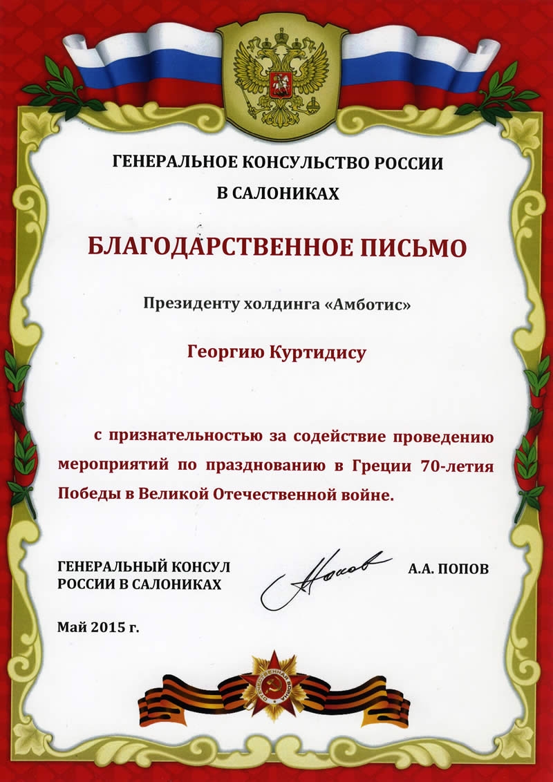 Генеральное консульство России в Салониках направило в адрес холдинга "Амботис" благодарственное письмо в знак признательности за содействие в проведении мероприятий посвященных празднованию 70-летия Победы в Великой Отечественной Войне.
